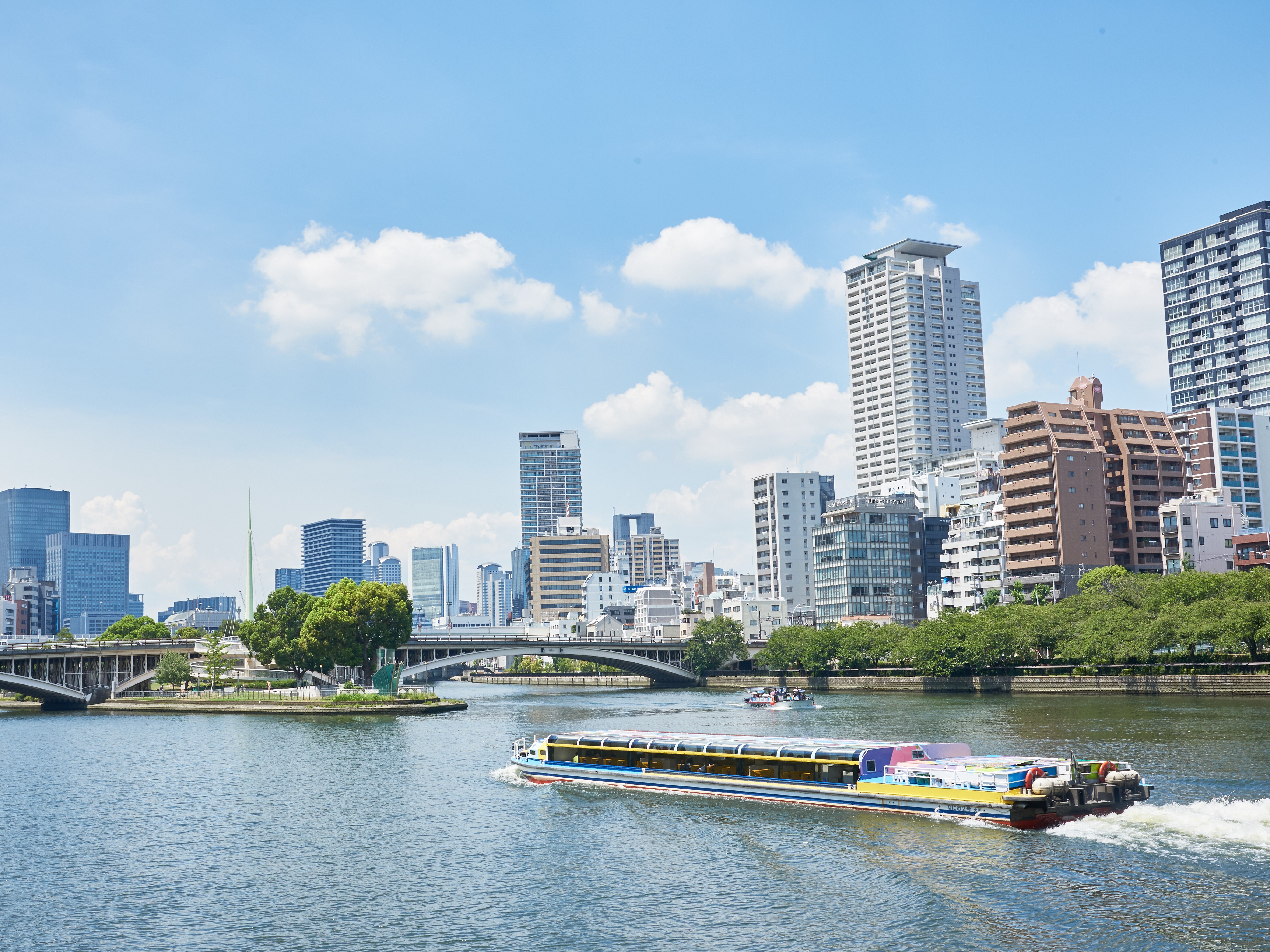 水の都・大阪を川面から眺める観光船。大阪城や大阪市中央公会堂、北浜のレトロビル群など、水辺に広がる名所・旧跡を約40分かけて巡ります。 春の桜、夏の新緑、秋の紅葉といった、季節を感じられる都市の自然豊かな景色も魅力の一つ。 船内では、ドリンクやスナック、アイスクリームを販売していて、飲み物片手にのんびりとした時間が過ごせます。